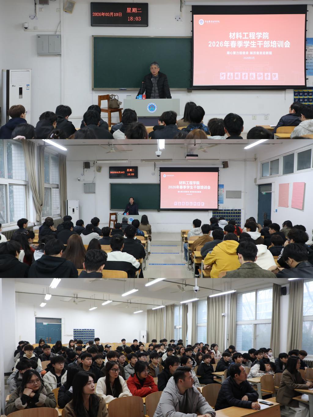 为提升学生骨干素质与履职能力,夯实新学期学生工作基础,3月10日下午,材料工程学院在一站式社区召开2026年新学期学生骨干培训会议,学院党总支书记王冠、副书记余湾、团总支书记(学工办主任)张佳、全体辅导员及学生骨干参会。