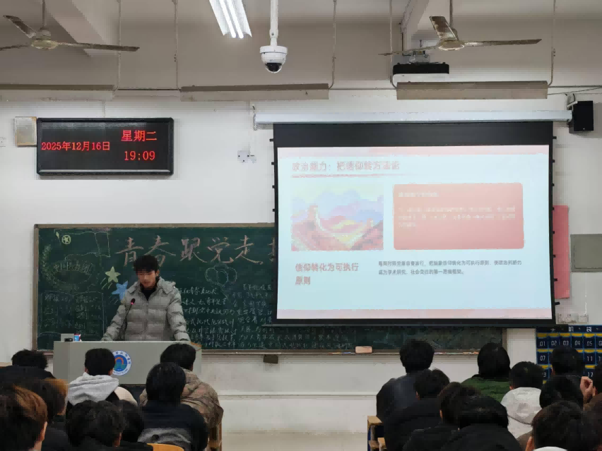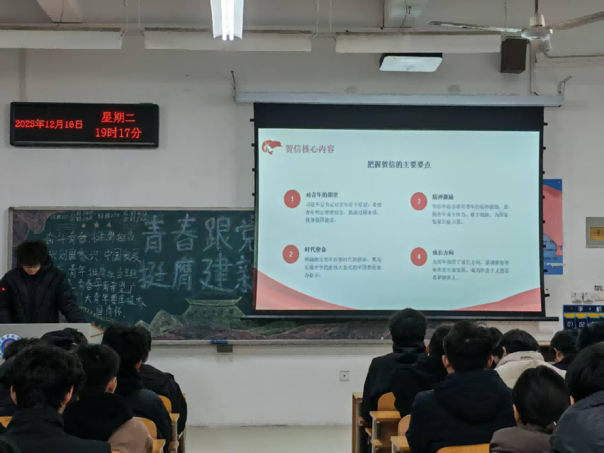 团课伊始,团支书详细解读了习近平总书记重要贺信的核心要义,强调总书记“坚定理想信念,厚植家国情怀,勇担历史使命”的殷切嘱托,为新时代青年成长成才指明了方向、提供了根本遵循。随后,通过专题宣讲、视频展播等形式,深入学习党中央致词中对青年“立志做有理想、敢担当、能吃苦、肯奋斗的新时代好青年”的明确要求,阐释了中国式现代化建设征程中青年的历史方位与责任担当。